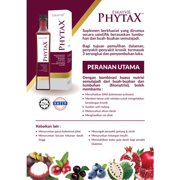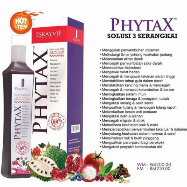Dengan Phytax yang merupakan formulasi unik gabungan kuasa nutrien antioksidan semulajadi terkuat di dunia anda mampu mencegah memulihkannya. Membantu menstabilkan paras kolestrol Mempunyai tahap antioksidan yang tinggi Melawan penyakit Jantung Memberi dan merangsangkan tenaga Batin. To date Eskayvie Phytax has been in the market for 5 years and is part of the daily juice of Malaysians.